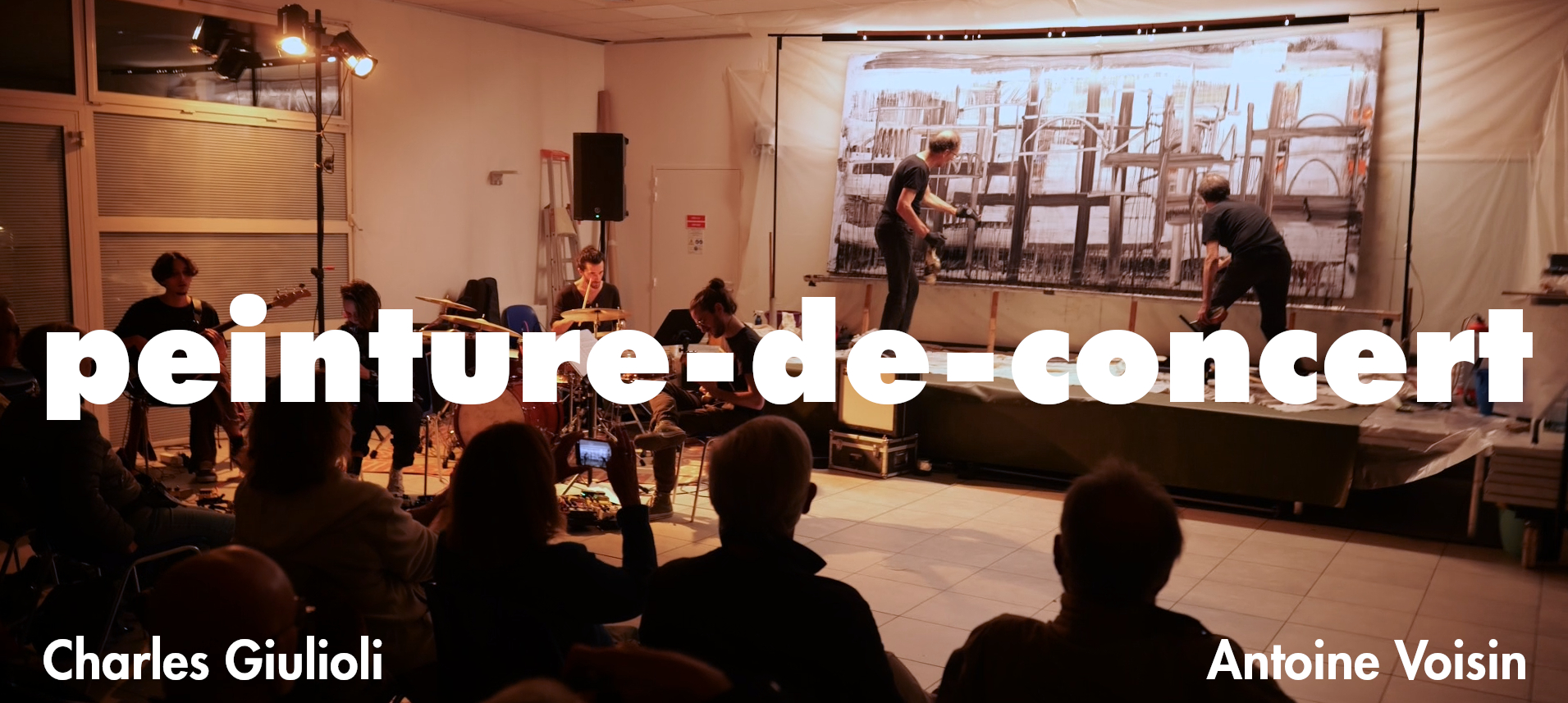 « La peinture est un spectacle vivant » Les artistes Charles Giulioli et Antoine Voisin recréent sur la toile la musique que les musiciens jouent sur la scène.C’est l’aventure d’une peinture au présent, improvisée, éphémère, à l’écoute de la musique.